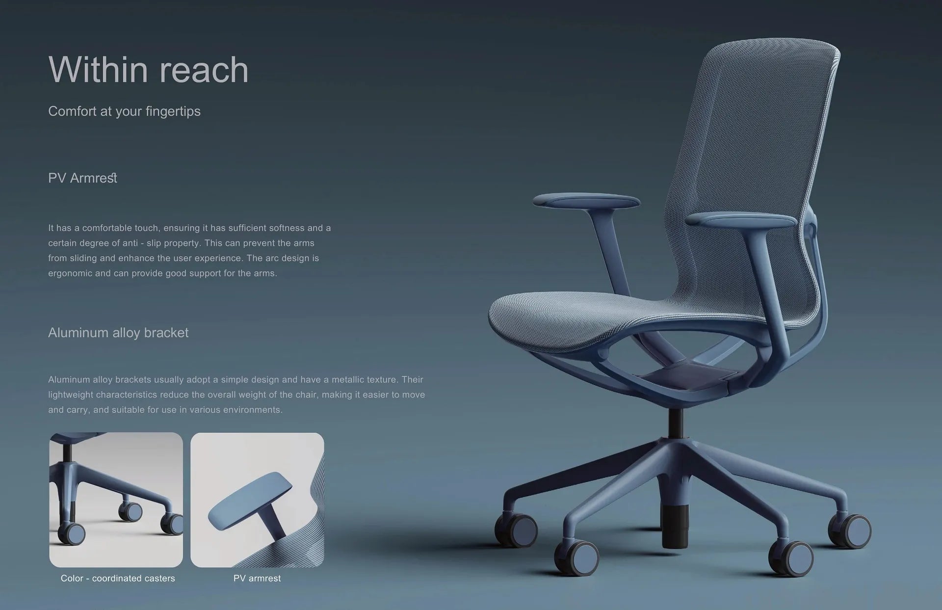 - Frame: Light grey PA (nylon) frame with fixed grey PU armrests